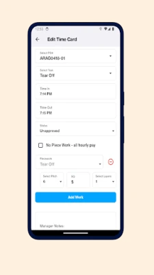 - Easily set up predefined piece rate activities to pay your workers - Roofers can calculate workers rates by pitch or layers - Users clock in, clock out, and record their piece work daily - Reports show how much your workers earned in a specific pay period - Workers clock in by job for deadly accurate job costing - GPS tracker to see crew locations