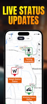 Check live parking availability at Truck Stops, Rest Areas, and Public Parking locations, helping you find safe spots quickly.